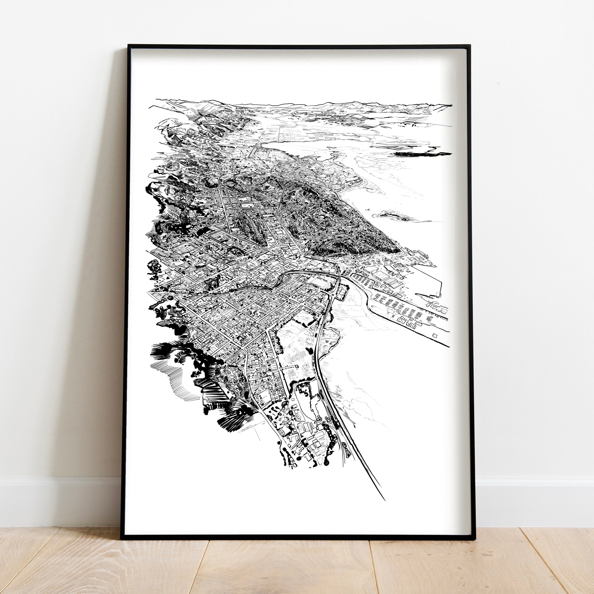 • Load image into Gallery viewer, A black and white illustrated map of Nelson laid out on white paper within a black frame against a white wall.