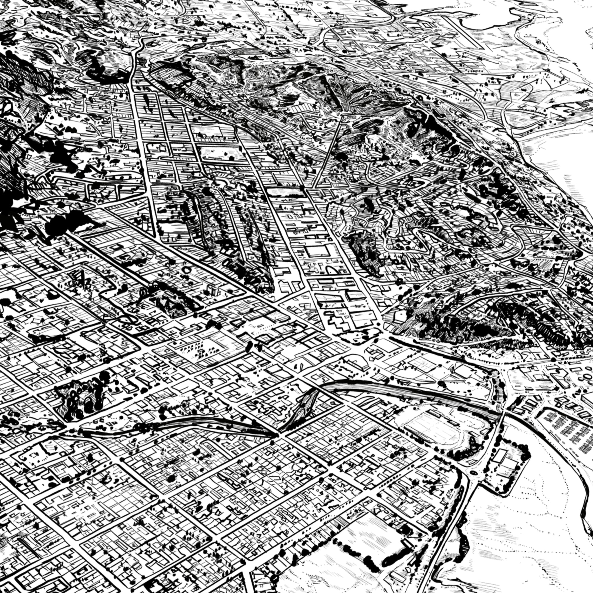 A black and white illustrated map of Nelson laid out on white paper against a white wall.